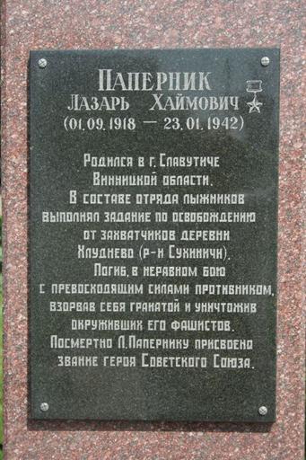 Keywords: Papernik memorial Moscow table.jpg Памятник Ге ою Советского Союза Л Х Папе нику на улице Папе ника в оскве Табличка с надписью own 2007-05-28 Alex Rave cc-by-sa-2 5 PD-trivial PD-RU-exempt See also Image Papernik memorial Moscow jpg Lazar Papernik memorial |