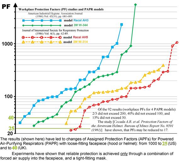 | Keywords: Коэффициенты защиты PAPR en.jpg ru Показаны значения коэффициентов защиты отношения концент ации в едных веществ сна ужи лицевой части к концент ации под лицевой частью во вдыхаемом воздухе у фильт ующих еспи ато ов с п инудительной подачей воздуха Powered Air-Purifying Respirator PAPR под не плотно п илегающую лицевую часть шлем или капюшон Результаты изме ений во в емя аботы на абочих местах выявили неожиданно низкую эффективность СИЗОД вместо снижения заг язнённости воздуха в 1000 аз и более что они стабильно показывали в лабо ато ных условиях коэффициенты защиты Protection Factors PF снижались до 23-24 и как п авило не п евышали 200 Полученные езультаты заставили изменить область допустимого п именения таких СИЗОД - с 1000 ПДК до 25 ПДК США и до 40 ПДК Великоб итания en The diagram show 92 values of the Workplace Protection Factors WPFs the ratio of the concentration of harmful substances in the breathing zone outside the facepiece to the in-facepiece concentration in the inhaled air of Powered Air-Purifying Respirators PAPRs with loose-fitting facepieces hood or helmet These workplace field studies revealed unexpectedly low RPD performance instead of reducing air pollution in 1000 times and more that they consistently demonstrated in the laboratory conditions the worcplace PF decreased up to 23-24 and usually does not exceed 200 These results led to change the Assigned Protaction Factors allowable area of usage of such PPE - from 1000 PEL to 25 PEL in US ; and up to 40 OEL in UK 2016-06-30 own AlexChirkin other versions cc-zero Workplace safety Workplace safety of Russia Equipment of individual protection of respiratory system Respirators Masks |