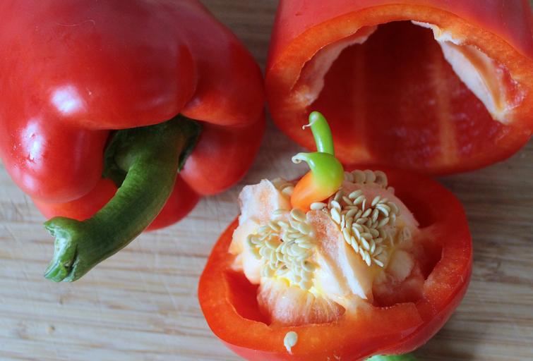 Keywords: paprika peppers vegetables food healthy red pepper rich in vitamins vegetarian vitamins vegan seeds white separating skin siel cut in half vitamin c delicious frisch juicy