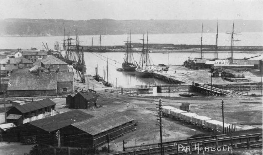 Keywords: Par Harbour from Par Mount.jpg en Par harbour Cornwall United Kingdom Looking south from Par Mount with the Long Quay on the left Short Quay on the right and the breakwater in the middle distance with Polkerris across Par Bay The line of wagons in the foreground carry china clay which will be loaded into ships here The small steam ship is Treffry the local tug which worked here and at Fowey A postcard in the Geof Sheppard Collection author ca 1905 PD-old Par harbour Cornwall Kaolin Cornwall Minerals Railway Railway postcards of the United Kingdom Postcards of Cornwall |