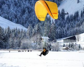 Keywords: paraglider paragliding air sports sport fly sky yellow floating sailing pilot man human person sliding gliding mountain mountains drag pull up hobby snow winter nature switzerland