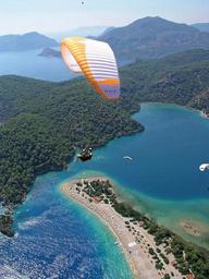 Keywords: paragliding parachute sky air paraglider freedom adventure extreme sport activity aerial view view land bay beach harness extreme sports people leisure outdoors blue blue sky summer sunny clear color day high landscape