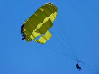 Keywords: parasailing controllable parachuting top parachute fly bird's eye view paragliding hang gliding sky blue neon yellow human depend