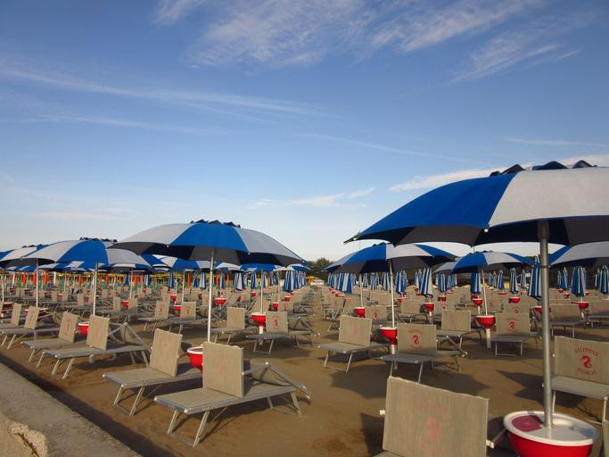 Keywords: parasols sun loungers sand beach sea holiday deck chair concerns summer heat tourism italy adriatic sea mass tourism