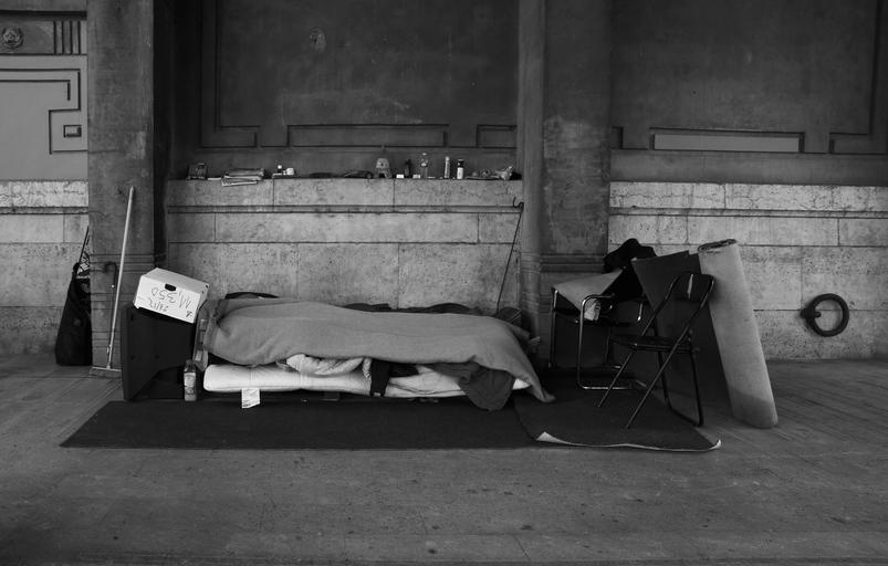 Keywords: paris france city cities urban black and white cot homeless misery shelter belongings