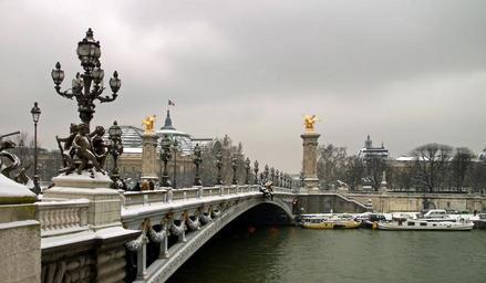 Keywords: paris france pont alexandre iii bridge buildings architecture winter snow river water sky clouds city cities urban