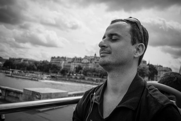 Keywords: paris tourism man black and white seine river hop on