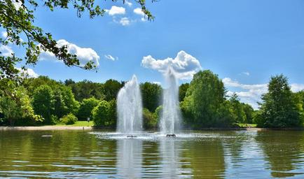 Keywords: park green area rush green meadow trees garden close blue leaves lake fontaine water feature water