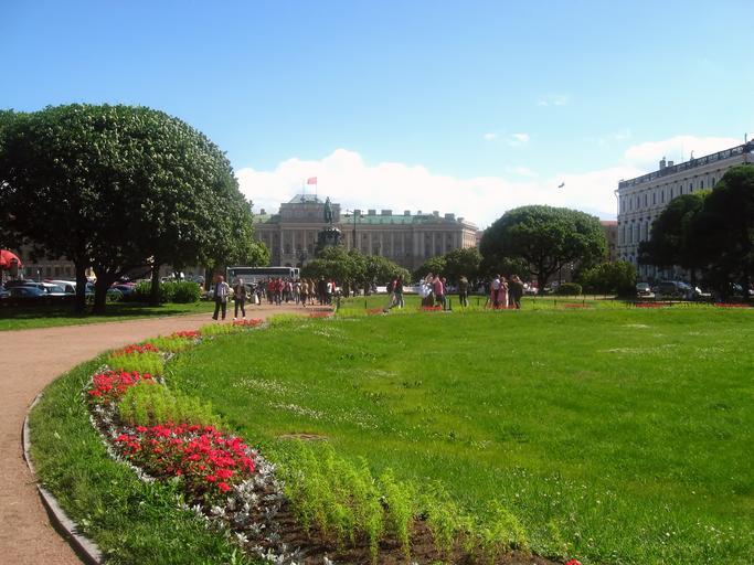 Keywords: park lawn flower trees people sky blue holy isaac square peter russia