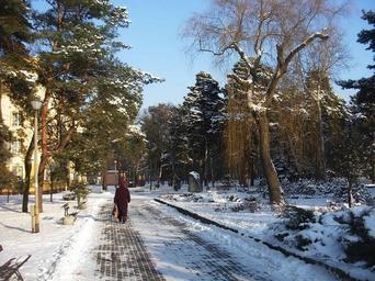Keywords: park winter snow ice landscape trees nature outside city urban cities sidewalk woman walking buildings scenic