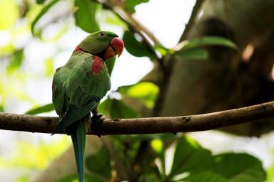 Keywords: parrots birds forests greenery plumage feathers red beak exotic tropical colorful wildlife sitting trees branches leaves background flora fauna single alone isolated