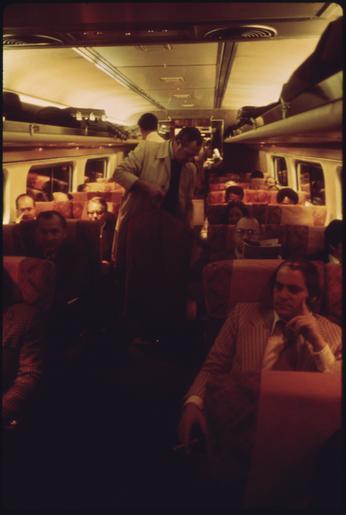 | Keywords: PASSENGERS ABOARD A METROLINER ENROUTE FROM WASHINGTON DISTRICT OF COLUMBIA, TO NEW YORK CITY - NARA - 556671.tif Scope and content PASSENGERS ABOARD A METROLINER ENROUTE FROM WASHINGTON DISTRICT OF COLUMBIA TO NEW YORK CITY IT IS ONE OF THE CORPORATION's TRAINS WHICH MAKE 16 ROUND TRIPS DAILY BETWEEN THE TWO CITIES WITH FOUR TO FIVE STOPS ENROUTE AMTRAK IS TRYING TO ACHIEVE A 55 PERCENT LOAD FACTOR AND IS NEAR THE 50 PERCENT FIGURE AT THIS TIME TO ACHIEVE A MUCH HIGHER LOAD FACTOR THE CORPORATION WOULD HAVE TO PACK PEOPLE IN THE TRAINS DURING PEAK PERIODS SOME 18 000 000 PASSENGERS IN THE U S RODE AMTRAK IN 1974 AN INCREASE OF 10 PERCENT General notes 556671 Local identifier 412-DA-14219 Environmental Protection Agency 12/02/1970 - NARA-Author Pickerell Jim 1936- Photographer 4588217 <br /> Washington Washington D C inhabited place 4201961 38 883 -77 033 <br /> Still Picture Records Section Special Media Archives Services Division NWCS-S National Archives at College Park 8601 Adelphi Road College Park MD 20740-6001 04/1974 Record group Record Group 412 Records of the Environmental Protection Agency 1944 - 2006 Record group ARC 708 DOCUMERICA The Environmental Protection Agency's Program to Photographically Document Subjects of Environmental Concern compiled 1972 - 1977 Series ARC 542493 File unit File unit ARC Variant control numbers Agency-Assigned Identifier 237/59/014219<br /> NAIL Control Number NWDNS-412-DA-14219 yes Other versions <gallery> File PASSENGERS_ABOARD_A_METROLINER_ENROUTE_FROM_WASHINGTON_DISTRICT_OF_COLUMBIA _TO_NEW_YORK_CITY_-_NARA_-_556671 tif tif File PASSENGERS_ABOARD_A_METROLINER_ENROUTE_FROM_WASHINGTON_DISTRICT_OF_COLUMBIA _TO_NEW_YORK_CITY_-_NARA_-_556671 jpg jpg </gallery> NARA-cooperation PD-USGov NARA TIF images with categorized JPGs |