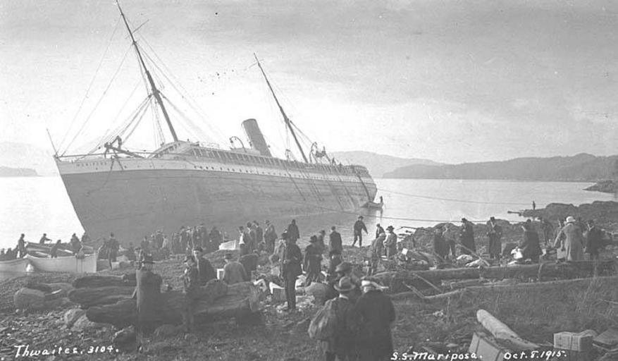 View Original:Passengers on shore beside wreck of steamer MARIPOSA, Fitz Hugh Sound, British Columbia, October 8, 1915 (THWAITES 148).jpeg.jpg (766x447)