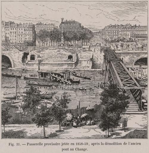 | Keywords: Passerelle provisoire jetée en 1858-59, après la démolition de l'ancien Pont au change.jpg Artwork The 1858-1859 pedestrian bridge that was temporarily built to replace the recently demolished Pont au change The Pont au change bridge was originally built in 1647 and was located in the Châtelet district 1875-1882 lithograph 9 8 x 10 6 cm Institution Brown University Library object history exhibition history credit line Published in Theodor Josef Hubert Hoffbauer Paris à travers les âges Paris Firmin-Didot et cie 1885 accession number 1172175960306100 PD-old Lithographs of Paris Images of Paris from the Brown University Library Paris à travers les âges Historical images of Pont au Change Footbridges in Paris 1858 in Paris 1859 in Paris Temporary buildings in France Temporary bridges Place du Châtelet Paris |