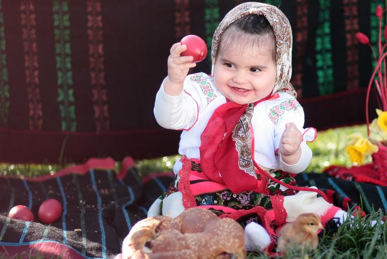 Keywords: pasta toddler girl egg traditional costume green flowers grass