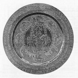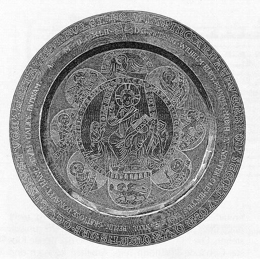 Keywords: Patene Chorin.JPG Patene Abendmahlsteller von 1280/1290 aus dem Kloster Chorin heute in der Berliner Nikolaikirche Sie zeigt neben dem zentralen thronenden Gott laut Inschrift den Brandenburger Markgrafen Mitregent Johann II und seine Gemahlin Hedwig von Werle Der innere später hinzugefügte Ring hält fest dass der Große Kurfürst die Patene 1642 der Berliner Nikolaikirche schenkte Paten created 1280/1290 in the abbey Kloster Chorin showing Co-ruler Margrave John II ca 1237 “1281 Margraviate of Brandenburg and his wife Hedwig von Werle Wolfgang Erdmann Zisterzienser-Abtei Chorin Geschichte Architektur Kult und Frömmigkeit Fürsten-Anspruch und -Selbstdarstellung klösterliches Wirtschaften sowie Wechselwirkungen zur mittelalterlichen Umwelt Unter Mitarbeit von Gisela Gooß Manfred Krause u Gunther Nisch Mit ausführlichem Literaturverzeichnis Königstein i Ts 1994 Die Blauen Bücher ISBN 3-7845-0352-7 page 12 Der Teller befindet sich in der Berliner Nikolaikirche 1280/1290 author PD-old Liturgy Patens Kloster Chorin historische Abbildungen Johann II Brandenburg Hedwig of Werle |