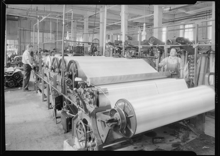 Keywords: Paterson, New Jersey - Textiles. Jackson Winding and Warping Company - NARA - 518768.jpg Scope and content Paterson New Jersey - Textiles Jackson Winding and Warping Company Picture of a Charles B Johnson Sizing Machine This is the latest High Speed Sizing Machine and is known as a Seven Can Type The cloth goes through this machine at the rate of 80 yards a minute and can do a 1 200 yard warp in about 45 minutes This estimate of time includes the tying up and removing of the warp These sizing machines come with a different number of cans The Five Can Type can do about 35 yards a minute and completes the warp in approximately an hour The Three and Two Can Types do about 22 yards a minute and complete a warp is about 1-1/4 to 1-1/2 hours Regardless of the number of cans involved in a particular machine the sizing requires 2 operators on the machine in use General notes 518768 Local identifier 69-RP-709 Federal Works Agency Work Projects Administration National Research Project ca 1941 - ca 1942 NARA-Author Hine Lewis Wickes 1874-1940 Photographer 1122914 <br /> Paterson Passaic New Jersey United States North and Central America inhabited place 4202736 40 917 -74 167 <br /> Still Picture Records Section Special Media Archives Services Division NWCS-S National Archives at College Park 8601 Adelphi Road College Park MD 20740-6001 06/1937 Record group Record Group 69 Records of the Work Projects Administration 1922 - 1944 Record group ARC 398 Lewis Hine Photographs for the National Research Project compiled 1936 - 1937 Series ARC 518291 File unit File unit ARC Variant control numbers NAIL Control Number NWDNS-69-RP-709 Other versions <gallery> File Paterson _New_Jersey_-_Textiles _Jackson_Winding_and_Warping_Company_-_NARA_-_518768 tif tif File Paterson _New_Jersey_-_Textiles _Jackson_Winding_and_Warping_Company_-_NARA_-_518768 jpg jpg </gallery> NARA-cooperation PD-USGov Paterson New Jersey-Textiles Sizing machines |