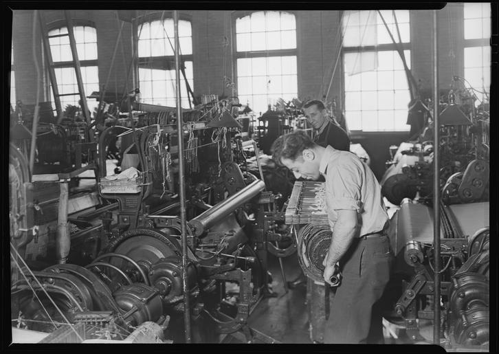 Keywords: Paterson, New Jersey - Textiles. Madison Silk Co. Setting new warp onto loom. - NARA - 518611.tif Scope and content General notes 518611 Local identifier 69-RP-373 Federal Works Agency Work Projects Administration National Research Project ca 1941 - ca 1942 NARA-Author Hine Lewis Wickes 1874-1940 Photographer 1122914 <br /> Paterson Passaic New Jersey United States North and Central America inhabited place 4202736 40 917 -74 167 <br /> Still Picture Records Section Special Media Archives Services Division NWCS-S National Archives at College Park 8601 Adelphi Road College Park MD 20740-6001 1937-03-18 Record group Record Group 69 Records of the Work Projects Administration 1922 - 1944 Record group ARC 398 Lewis Hine Photographs for the National Research Project compiled 1936 - 1937 Series ARC 518291 File unit File unit ARC Variant control numbers NAIL Control Number NWDNS-69-RP-373 yes Other versions <gallery> File Paterson _New_Jersey_-_Textiles _Madison_Silk_Co _Setting_new_warp_onto_loom _-_NARA_-_518611 tif tif File Paterson _New_Jersey_-_Textiles _Madison_Silk_Co _Setting_new_warp_onto_loom _-_NARA_-_518611 jpg jpg </gallery> NARA-cooperation PD-USGov Paterson New Jersey-Textiles Textile industry in New Jersey Silk weaving NARA TIF images with categorized JPGs