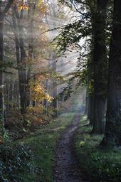 Keywords: path forest trees sunbeams country fog nature