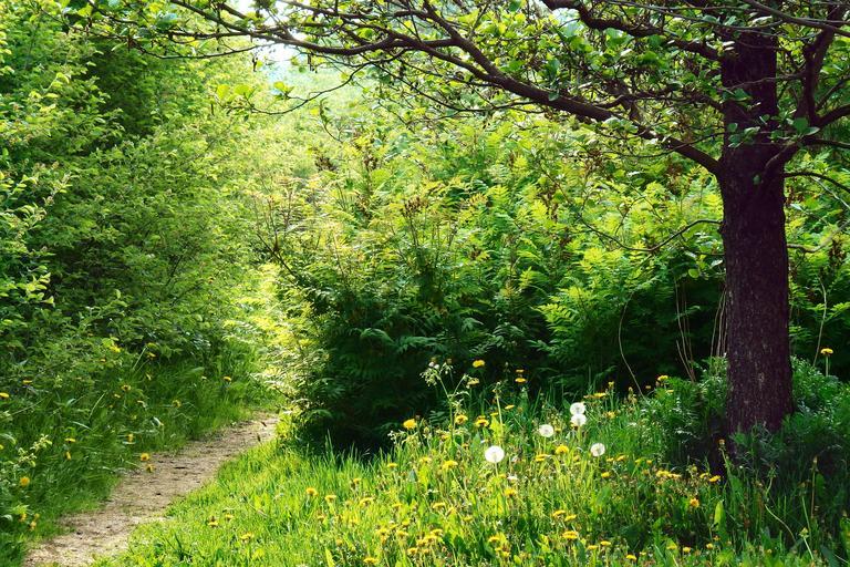 Keywords: path sunlight forest way nature trees countryside dandelions summer woods bushes outside