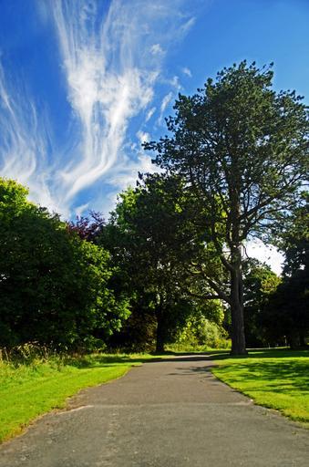 Keywords: path way tree trees nature green grass trip destination direction relaxation background sky blue clouds cloud season spring landscape