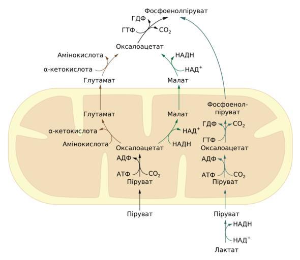 Keywords: Paths from pyruvate to PEP.svg uk Схема т ьох шляхів пе енесення п оміжних п одуктів глюконеогенезу із мітохонд ій у цитоплазму 2012-06-11 own Zlir'a Uploaded with UploadWizard Gluconeogenesis Diagrams in Ukrainian
