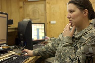 | Keywords: Patriot Support Soldiers pick up stakes, move to Forward Operating Base Hammer DVIDS134938.jpg en Capt Angela Sands a battalion operations officer from Fort Polk La assigned to Headquarters and Headquarters Company 94th Brigade Support Battalion 4th Brigade Combat Team 10th Mountain Division Multi-National Division “ Baghdad enters data into her computer Dec 2 Sands keeps things running smoothly on Forward Operating Base Hammer and provides operational focus in the Tactical Operations Center 2008-12-02 Staff Sgt Jeremy Todd https //www dvidshub net/image/134938 134938 2008-12-10 08 13 RUSTAMIYAH IQ PD-USGov Fort Polk Images from DoD uploaded by Fæ |