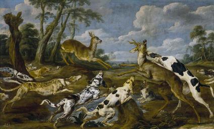 | Keywords: Paul de Vos - Deer Hunt.jpg Artwork en Deer hunt de Rehjagd Oil canvas cm 212 347 Madrid Institution Museo del Prado https //www museodelprado es/coleccion/galeria-on-line/galeria-on-line/obra/caceria-de-corzos/ Mid Other date century 17 creator Paul de Vos Other versions PD-old-100 Paintings by Paul de Vos in the Prado Museum Baroque paintings of animals Paintings of deer hunting Paintings of roe deer 17th-century paintings of dogs | ||||