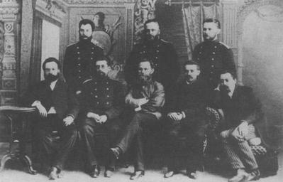 | Keywords: Pavlov with students (1891).JPG en Ivan Pavlov and his doctoral students at the Military Medical Academy in St Petersburg 1891 Sitting from left to right Ginzburg Burzhinsky Pavlov Kamensky Sabashnikov Standing Shulgin Osvyanitsky Glinsky pl Iwan Pawłow i jego doktoranci na Wojskowej Akademii Medyko-Chirurgicznej w Peterburgu 1891 Siedzą Gincburg Burzinski Pawłow Kamienski Sabasznikow Stoją Szulgin Oswianicki Glinski ru С диссе тантами фа макологической кафед ы Военно-медицинской академии Сидят Л С Гинзбу г И П Бу жинский И П Павлов Д А Каменский И Сабашников Стоят В И Шульгин Г С Освяницкий Д А Глинский 1891 г retrieved from http //www ihst ru/projects/sohist/papers/priroda/1999/8/pavlov pdf anonymous/unknown 1891 public domain due to its age PD-old Ivan Pavlov House of Shulgin Sabashnikov family |