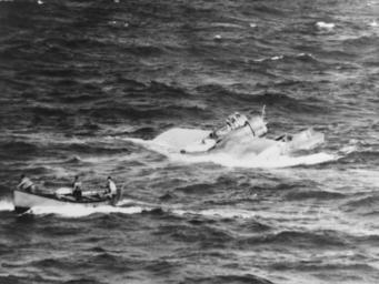 | Keywords: PBY-5 of VP-52 sinking off Galapagos in January 1942.jpg  The U S Navy Consolidated PBY-5 Catalina 52-P-11 from Patrol Squadron 52 VP-52 attached to Patrol Wing 2 PATWING TWO based at Seymour Bay Galapagos shown here on 17 January 1942 as a crew from the light cruiser USS Richmond CL-9 attempted to salvage the downed aircraft The PBY-5 BuNo 2368 of VP-52 made a hard a landing off Galopagoas Island on 9 January 1942 due to fuel exhaustion The crew pilot Lt jg W T Sutherland ENS W J Lahodney RM1 L L Weiss NAP RM2 J P Carlson SEA1 H C Martin AMM2 J W Miller and RM3 W B Valyou was rescued The crewless plane was taken under tow by USS Richmond CL-9 eight days later but sank in bad weather Official U S Navy photo http //www history navy mil/our-collections/photography/numerical-list-of-images/nhhc-series/nh-series/NH-86000/NH-86973 html NH 86973 from the U S Navy http //www history navy mil Naval History and Heritage Command 1942-01-17 U S Navy PD-USGov-Military-Navy Consolidated PBY Catalina Patrol Squadron 52 United States Navy Pacific War in January 1942 1942 in aviation in Ecuador Galápagos Islands |