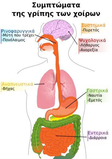 Keywords: PD Diagram of swine flu symptoms EL.svg Main symptoms of swine influenza Κύρια συμ τώματα της γρί ης των χοίρων File PD Diagram of swine flu symptoms EN svg which in turn is based on File Digestive_system_diagram_en svg File Expiration_diagram svg File Brain diagram ja svg Symptoms as described in http //www cdc gov/swineflu/key_facts htm Centers for Disease Control and Prevention > Key Facts about Swine Influenza Swine Flu 2009-07-28 Badseed using work by Mysid LadyofHats and WilliamTheaker SVG files on swine flu