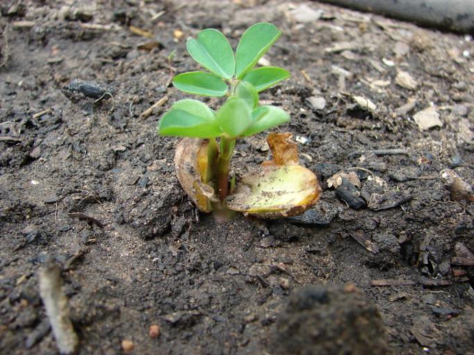 Keywords: Peanut Sprout.jpg en Sprout pushes seed peanut completely out of the ground Animals eat seed peanut and destroy sprout Two weeks from seed two days visible as sprout Two miles east of KMOB 2011-06-03 own NoNomme cc-zero Arachis hypogaea Fabales seedlings Cotyledons leaves |