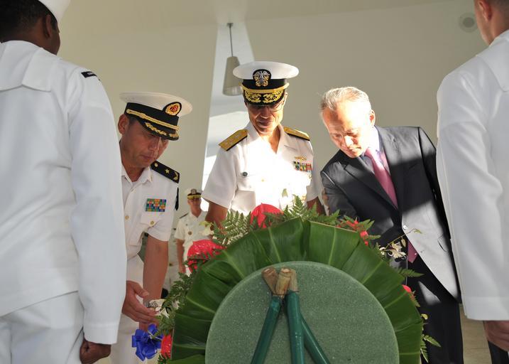 | Keywords: Pearl Harbor Ceremony 130906-N-IT566-168.jpg en From left to right Rear Adm Wei Gang chief of staff for North Sea Fleet Adm Cecil D Haney commander of U S Pacific Fleet and China's ambassador to the United States Cui Tiankai lay a wreath at the USS Arizona Memorial during a tour of historic Pearl Harbor sites Haney hosted Ambassador Cui and his delegation in conjunction with the ongoing port visit to Pearl Harbor by three Chinese navy ships Engagements such as this offer the U S Navy an opportunity to build a positive and constructive relationship with the Chinese Navy while encouraging multilateral cooperation enhancing transparency and mitigating risk U S Navy Photo by Mass Communication Specialist 2nd Class David Kolmel/Released 2013-09-07 Petty Officer 2nd Class David Kolmel https //www dvidshub net/image/1012003 130906-N-IT566-168 2013-09-07 01 33 JOINT BASE PEARL HARBOR-HICKAM HI US PD-USGov-Military-Navy 2013 in Pearl Harbor People at Pearl Harbor USS Arizona Memorial interior Images from DoD uploaded by Fæ |