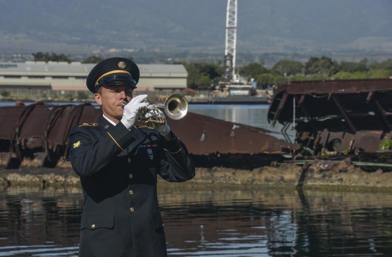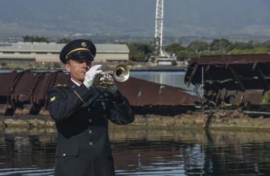 | Keywords: Pearl Harbor ceremony 150106-N-GI544-059.jpg en A bugler assigned to the Hawaii Army National Guard plays taps during an ash scattering ceremony for Bugler Master Tech Sgt Allen Bodenlos a Pearl Harbor survivor on Joint Base Pearl Harbor-Hickam Jan 6 Bodenlos ™s ashes were scattered in the waters near the USS Utah Memorial U S Navy photo by Mass Communication Specialist 2nd Class Laurie Dexter/Released 2015-01-06 Petty Officer 2nd Class Laurie Dexter https //www dvidshub net/image/1717689 150106-N-GI544-059 2015-01-09 14 00 PEARL HARBOR HI US PD-USGov-Military-Navy 2015 in Pearl Harbor People at Pearl Harbor Hawaii Army National Guard USS Utah Memorial Images from DoD uploaded by Fæ Taps bugle call |