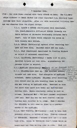 Keywords: pearl harbor pearlharbor attack december 7 1942 december71942 world war two worldwartwo document text outdoor Document from the Pearl Harbor Dispatch Special Collection which details the attack and the days following it. Repository: San Diego Air and Space Museum Archive Document from the Pearl Harbor Dispatch Special Collection which details the attack and the days following it. Repository: San Diego Air and Space Museum Archive |