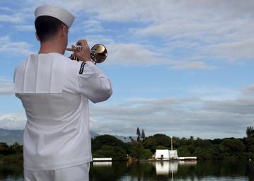 | Keywords: Pearl Harbor memorial service DVIDS134837.jpg en A Sailor from the U S Pacific Fleet Band plays taps during a joint U S Navy/National Park Service ceremony commemorating the 67th anniversary of the attack on Pearl Harbor The theme of this year's historic commemoration Pacific War Memories The Heroic Response to Pearl Harbor emphasized the brave efforts of those who fought at sea on land and in the air to turn the tide in the Pacific More than 2 000 distinguished guests and the general public joined service members Pearl Harbor survivors and their families and friends for the annual observance 2008-12-07 Chief Petty Officer David Rush https //www dvidshub net/image/134837 081210-N-+++++-001 2008-12-10 00 45 PEARL HARBOR HI US PD-USGov-Military-Navy People with trumpets Pacific Fleet Band Images from DoD uploaded by Fæ |