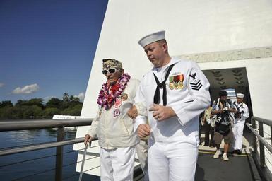 Keywords: Pearl Harbor remembered 131207-N-IU636-100.jpg en Pearl Harbor survivor Lou Conter and Electronic Technician 1st Class Michael Temple assigned to Navy Information Operations Center Hawaii visit the USS Arizona Memorial during the 72nd anniversary Pearl Harbor Day commemoration Pearl Harbor survivors and distinguished guests visited the memorial for the presentation of wreaths More than 2 500 guests including Pearl Harbor survivors and other veterans attended the National Park Service and U S Navy-hosted joint memorial ceremony at the World War II Valor in the Pacific National Monument U S Navy photo by Mass Communication Specialist Seaman Johans Chavarro/Released 2013-12-07 Petty Officer 3rd Class Johans Chavarro https //www dvidshub net/image/1069067 131207-N-IU636-100 2013-12-10 04 09 PEARL HARBOR HI US PD-USGov-Military-Navy USS Arizona Memorial Images from DoD uploaded by Fæ 72nd anniversary of Pearl Harbor attacks |