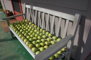 Keywords: pears pears on bench fruit green pears fall agriculture