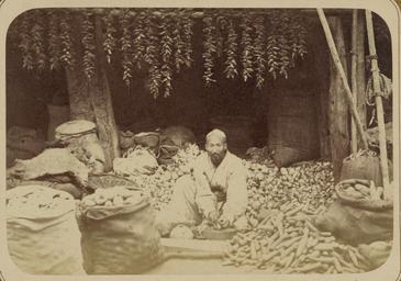 | Keywords: Peddling. Vendor of Carrots and Other Vegetables WDL10743.png Artwork ru Кун Александ Людвигович 1840 1888 гг fr Kun Aleksandr L 1840-1888 en Kun Aleksandr L 1840-1888 zh 亚历山大·L· ,1840-1888 年 pt Kun Aleksandr L 1840-1888 ar كُن، ألكسندر ل ، 1840-1888 es Kun Aleksandr L 1840-1888 ru елочная то говля П одажа мо кови и д угих овощей fr Colportage Marchand de carottes et autres légumes en Peddling Vendor of Carrots and Other Vegetables zh 售 胡 等蔬 商贩 pt Comércio de ambulantes Vendedor de cenouras e outros legumes ar الباعة المتجولون بائع جزر وخضروات أخرى ru Эта фотог афия входит в этног афическую часть <em> Ту кестанского альбома </em><em></em> всесто оннего исследования Цент альной Азии п едп инятого после того как в 1860-х годах в егионе установилось господство Российской импе ии Альбом созданный по аспо яжению гене ала Константина Пет овича фон Кауфмана 1818 1882 годы пе вого гене ал-губе нато а оссийского Ту кестана состоит из четы ех частей в шести томах «Часть а хеологическая» два тома «Часть этног афическая» два тома «Часть п омысловая» один том и «Часть исто ическая» один том Основным составителем альбома был оссийский востоковед Александ Людвигович Кун аботавший совместно с иколаем Венедиктовичем Богаевским В альбоме п едставлено около 1200 фотог афий а также а хитекту ные планы аква ельные исунки и ка ты «Часть этног афическая» включает в себя 491отдельную фотог афию на 163 листах а фотог афиях изоб ажены п едставители азличных на одов егиона листы 1 33 повседневная жизнь и итуалы листы 34 91 а также виды де евень и го одов уличные то говцы и комме ческая деятельность листы 92 163 <br>База ы; Этног афические фотог афии; П одавцы п одовольственных това ов; Рынки; То говцы; П одавцы; Фотог афические исследования; По т етные фотог афии; По т еты; Тю кские на оды; Овощи fr Cette photographie est extraite de la partie ethnographique de l'<em>Album du Turkestan</em> étude visuelle complète de l'Asie centrale entreprise après que l'Empire russe prit le contrôle de la région dans les années 1860 Commandé par le général Konstantin Petrovich von Kaufman 1818 1882 premier gouverneur général du Turkestan russe l'album est composé de six volumes en quatre parties la partie archéologique deux volumes la partie ethnologique deux volumes la partie sur les métiers un volume et la partie historique un volume L'album fut essentiellement compilé par l'orientaliste russe Aleksandr L Kun assisté de Nikolai V Bogaevskii Il comporte près de 1200 photographies et inclut également des plans architecturaux des dessins à l'aquarelle et des cartes La partie ethnographique compte 491 photographies sur 163 planches montrant des individus des différentes peuplades de la région planches 1 à 33 des scènes de la vie quotidienne et des rites planches 34 à 91 ainsi que des vues de villages et de villes de vendeurs ambulants et d'activités commerciales planches 92 à 163 <br>Bazars; Photographies ethnographiques; Épiciers; Marchés; Marchands; Marchands ambulants; Inventaires photographiques; Portraits photographiques; Portraits; Peuples turciques; Légumes en This photograph is from the ethnographical part of <em>Turkestan Album</em><em> </em>a comprehensive visual survey of Central Asia undertaken after imperial Russia assumed control of the region in the 1860s Commissioned by General Konstantin Petrovich von Kaufman 1818 82 the first governor-general of Russian Turkestan the album is in four parts spanning six volumes Archaeological Part two volumes ; Ethnographic Part two volumes ; Trades Part one volume ; and Historical Part one volume The principal compiler was Russian Orientalist Aleksandr L Kun who was assisted by Nikolai V Bogaevskii The album contains some 1 200 photographs along with architectural plans watercolor drawings and maps The Ethnographic Part includes 491 individual photographs on 163 plates The photographs show individuals representing the different peoples of the region Plates 1 33 ; daily life and rituals Plates 34 91 ; and views of villages and cities street vendors and commercial activities Plates 92 163 <br>Bazaars; Ethnographic photographs; Food vendors; Markets; Merchants; Peddlers; Photographic surveys; Portrait photographs; Portraits; Turkic peoples; Vegetables zh 这张照片出自<em> 其斯 相册 </em>的民族部分,该相册是俄罗斯 国 19 世纪 60 年代取得中亚控制 后, 手制 的 部针对该 区的综合 图像调查记录 相册由俄罗斯驻 其斯 (俄罗斯 国中亚属 的名称)首任 康斯 丁·彼得罗维奇·凡· 夫曼(Konstantin Petrovich von Kaufman,1818 82 年)将军赞助完成,共分六卷,四个部分: 古部分 (两卷); 民族部分 (两卷); 贸易部分 ( 卷)和 历史部分 ( 卷) 相册的主要编纂人是俄罗斯 方学 亚历山大·L· Aleksandr L Kun 亚历山大是 尼可莱·V·柏盖维斯基 Nikolai V Bogaevskii 的