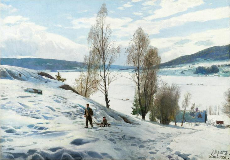 Keywords: Peder Mønsted - Vinterdag ved Odnes, Norge.jpg Artwork Creator Peder Mønsted 1935 Oil on canvas cm 35 5 50 5 object history Provenienz Kleis Georg Westerbro credit line signed and dated P Mônsted / Odnes 1935 lower right; titled and inscribed Randsfjorden on the reverse accession number http //www sothebys com/de/auctions/ecatalogue/2008/the-scandinavian-sale-l08104/lot 273 html Sotheby's PD-old-70 Peder Mønsted Winter in art Landscape paintings of Norway 20th-century landscape paintings Images from Sotheby's Sledding in Norway
