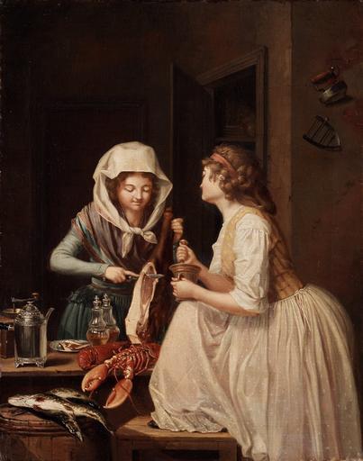 | Keywords: Pehr Hilleström-Tvänne Qvinnor, den ena skär skinka, den andra stöter peppar.jpg title Tvänne Qvinnor den ena skär skinka den andra stöter peppar Two women one cuts ham the other grounds pepper 1794 https //www bukowskis com/sv/auctions/574/230-pehr-hillestrom-tvanne-qvinnor-den-ena-skar-skinka-den-andra-stoter-peppar creator Pehr Hilleström Oil on canvas 60 x 47 cm Custom license marker 2014 04 06 PD-old-100 Uploaded with UploadWizard Pehr Hilleström Cuisine in art | ||||