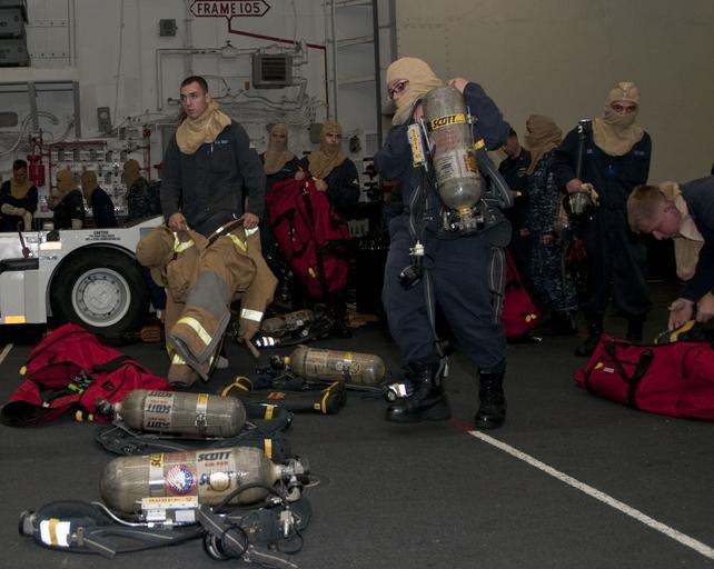 | Keywords: Peleliu conducts flying squad drill 120602-N-RZ374-001.jpg en U S sailors don firefighting gear and equipment prior to a flying squad drill aboard the amphibious assault ship USS Peleliu LHA 5 June 2 2012 in port in San Diego Calif U S Navy photo by Mass Communication Specialist 3rd Class Ian Campbell/Released 2012-06-02 Seaman Ian M Campbell https //www dvidshub net/image/667092 120602-N-RZ374-001 2012-09-18 03 17 AT SEA PD-USGov-Military-Navy USS Peleliu LHA-5 USS Peleliu LHA-5 Images from DoD uploaded by Fæ |