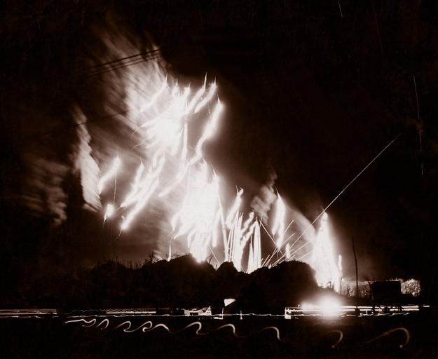 | Keywords: Peleliu's Great White Way.jpg Peleliu's Great White Way time exposure photo of Japanese attack on U S Marine positions 1944 <br />This dramatic time exposure made in the Fall of 1944 records a fierce night assault by Japanese forces against U S Marines on Peleliu in the Palau Islands Japanese forces were dug in behind Bloody Nose Ridge visible below a night sky lit up by parachute flares The long straight lines are tracer shells from Japanese gunners firing on Marine aircraft At the right edge of the photo a Marine machine gun is firing The headlights of a passing Jeep are recorded The wavy line is from a flashlight carried by a Marine as he runs for cover The bright burst of light at the lower right is from a motion picture projector showing a movie just prior to the attack This incredible picture was made by SSgt William G Wilson USMC a combat cameraman with the 2nd Marine Air Wing The photo was published in over 500 newspapers and was recognized by CDR Edward Steichen Chief of Naval Photography as one of the best pictures depicting action in the Pacific theater Official USMC photo by SSgt William G Wilson 1944 SSgt William G Wilson PD-USGov-Military-Navy Original upload log en wikipedia Peleliu 27s+Great+White+Way jpg wikitable - 2010-01-02 01 49 5472×4480× 19980477 bytes W3BIG Peleliu's Great White Way time exposure photo of Japanese attack on U S Marine positions 1944 Official USMC photo by SSgt William G Wilson 1944 SSgt William G Scanned with HP Photosmart C7200 Battle of Peleliu Tracers |