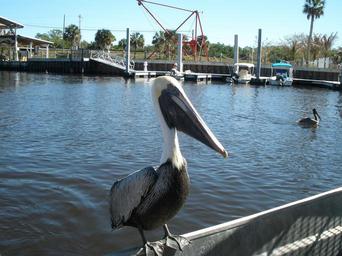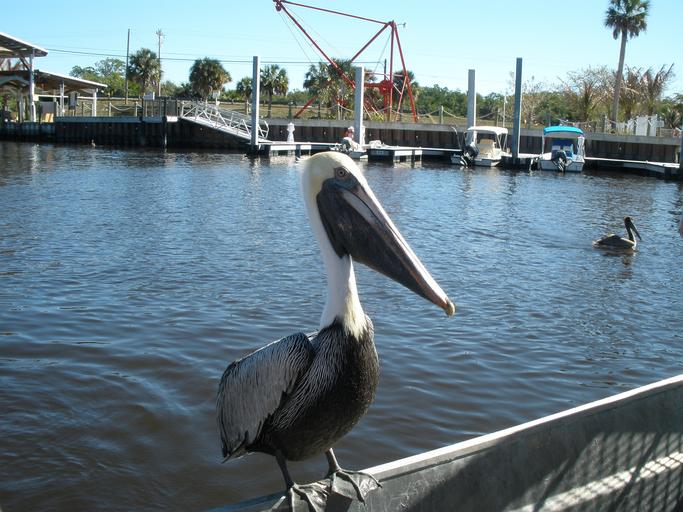 Keywords: pelican water florida wildlife bird pelicans feathers boats waterfowl wing pier