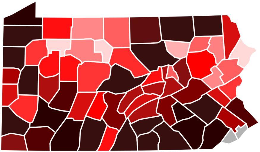 Keywords: Pennsylvania Farm Concentration by County.svg heat map of the concentration of farms in Pennsylvania by county Data acquired from the http //farm-numbers findthedata org/ National Agricultural Statistics Service and divided into a color-coded hierarchy as follows FFD5D5 0-99 FFAAAA 100-199 FF8080 200-299 FF5555 300-399 FF2A2A 400-499 FF0000 500-599 D40000 600-699 AA0000 700-799 800000 800-899 550000 900-999 2B0000 1000+ gray No data own Tyrol5 2012-01-30 Agriculture in Pennsylvania Maps of Pennsylvania