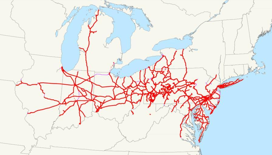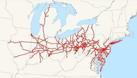 Keywords: Pennsylvania Railroad system map (1918).svg This is a map of the Pennsylvania Railroad system as of 1918 with trackage rights in purple and future lines dotted The two disconnected pieces in West Virginia are not an error; they are remaining portions of the Little Kanawha Syndicate properties that were partially controlled by the PRR-owned Pennsylvania Company Email me if you would like a copy of the GIS data I created modified from Bureau of Transportation Statistics North American Transportation Atlas Data or if you see any errors 2009-03-18 own assumed NE2 Maps of the Pennsylvania Railroad
