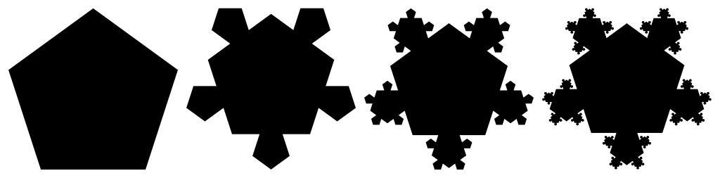 | Keywords: Pentagonal-fractal-example.svg Three iterations of a simple pentagonal fractal where a pentagon has smaller pentagons placed along each of its sides recursively For a variation of this where the smaller pentagons are within the larger pentagon not outside see the top row of File Pentagonal-fractals-3 svg Self-made graphic converted from a version of the following vector PostScript source code <pre> 306 396 translate 3 dup scale/plr dup 3 2 roll 72 mul 90 add dup 3 1 roll cos mul 3 1 roll sin mul def/a 52 57315251 def/P 0 a plr 4 a plr 3 a plr 2 a plr 1 a plr 0 a plr moveto 5 lineto repeat closepath fill def/Q 0 5 a plr 4 5 a plr 3 5 a plr 2 5 a plr 1 5 a plr 0 5 a plr moveto 5 lineto repeat closepath fill def P gsave 5 gsave 0 -55 03715053402 translate 294 dup scale Q 5 gsave 0 55 03715053402 translate 294 dup scale P 5 gsave 0 -55 03715053402 plr translate 294 dup scale 36 Q grestore 72 rotate repeat grestore 72 rotate repeat grestore 72 rotate repeat grestore showpage EOF</pre> 2009 AnonMoos Regular pentagons Pentagonal fractals Koch snowflakes Images with PostScript source code Order |
