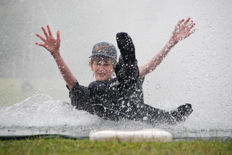 Keywords: people child sports baseball sliding train water drop wet fun