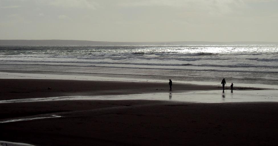Keywords: people ocean shore beach silhouettes shadows sand landscape seascape cloudy overcast standing clouds waves sea water reflection lonely