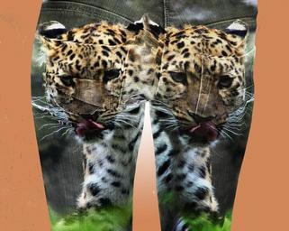 Keywords: people person girl woman rear jeans panther manipulation colour whiskers young female feline funny fun eyes head animal wild behind